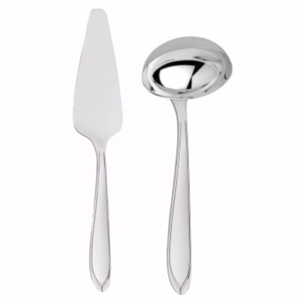01 Pegador para Massa / 01 Colher para Arroz / 01 Concha para Feijão / 12 Colheres de Mesa / 12 Garfos de Mesa / 12 Colheres para Chá / 12 Colheres para Cafe / 02 Talheres para Salada / 12 Garfos para Torta / 12 Facas para Churrasco / 01 Pá para Bolo / 01 Garfo Trinchante / 12 Colher Média.
