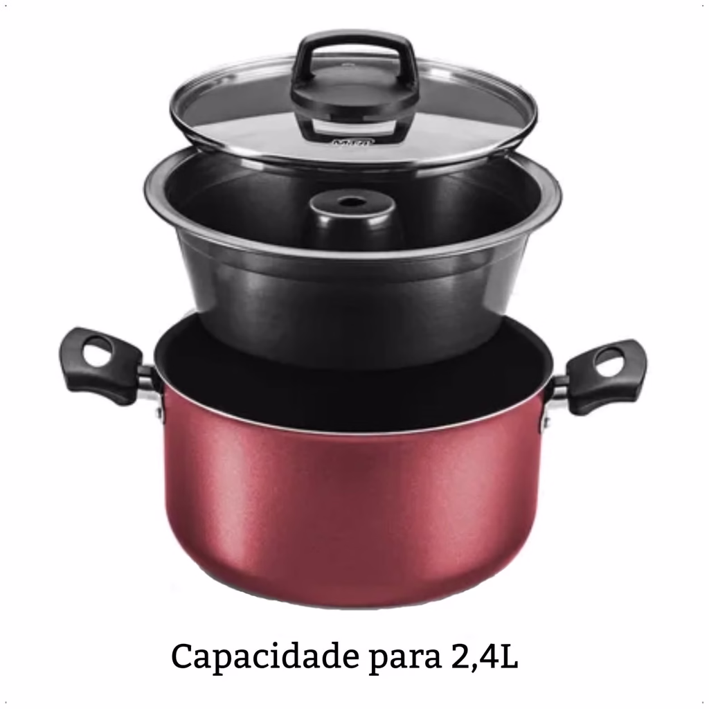Composto por uma caçarola e uma forma com revestimento interno e externo em antiaderente, ele oferece um cozimento rápido e uniforme dos alimentos além de utilizar sua forma também para bolo e evita que eles grudem em seu revestimento, o que proporciona maior facilidade na limpeza.