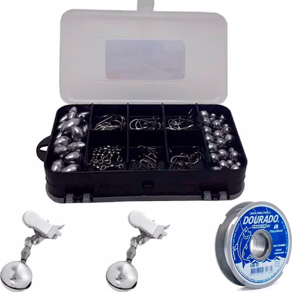 Kit Estojo Pesca Esportiva Linha Sinete Giradores Chumbada e AnzolKit Estojo Pesca Esportiva Linha Sinete Giradores Chumbada e Anzol