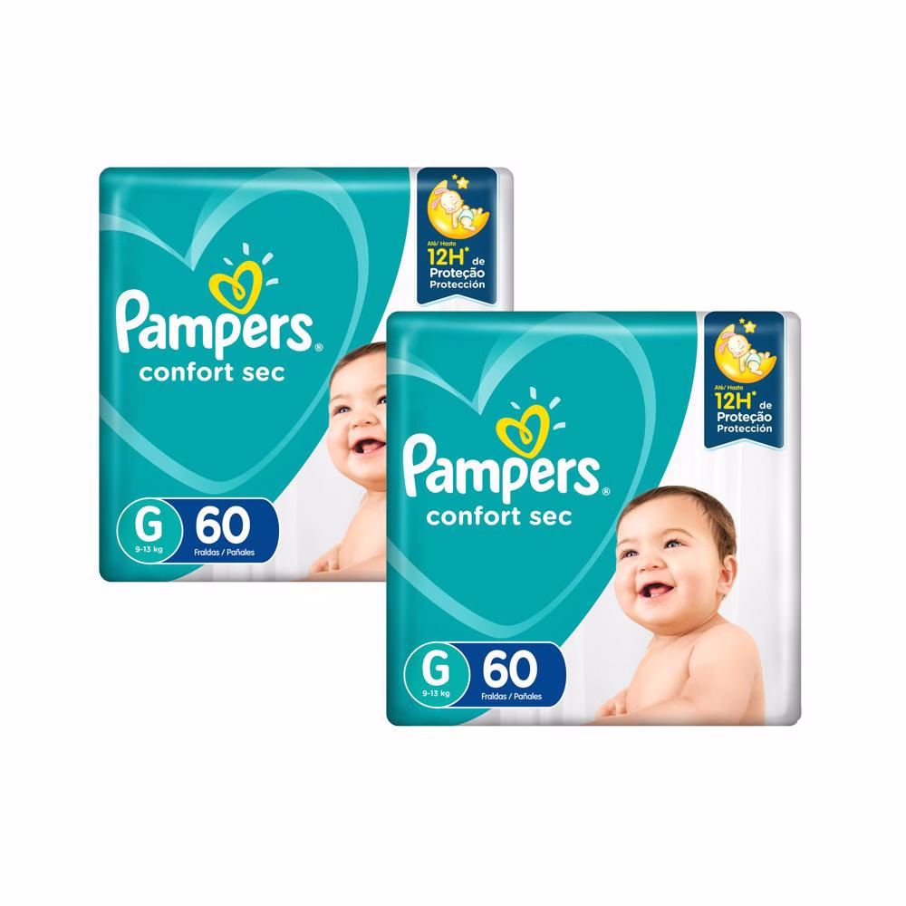 O Kit contém: 2 pacotes de Fralda Pampers Confort Sec Super Tamanho G com 60 unidades cada. Experimente a NOVA Pampers confort sec com canais de ar! Que permitem que o ar circule livremente dentro da fralda, para o bumbum ficar menos abafado, e a pele arejada e sequinha durante a noite.