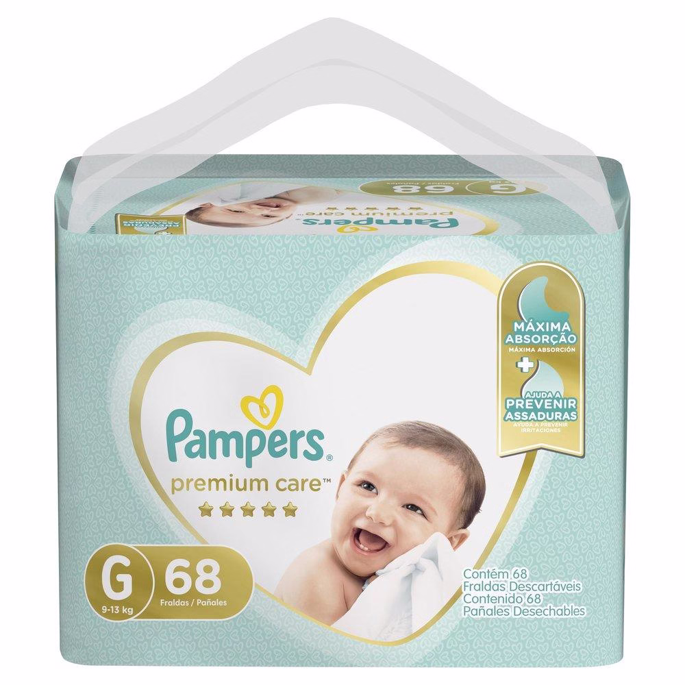 O Kit contém: 3 pacotes de Fralda Pampers Premium Care Jumbo Tamanho G com 68 unidades cada. Pampers Premium Care, nossa proteção mais suave para a sua pele. É suave como o algodão e ultra respirável. Também tem canais de ar para uma pele seca e arejada, e uma loção hipoalergênica exclusiva que ajuda a prevenir irritações.