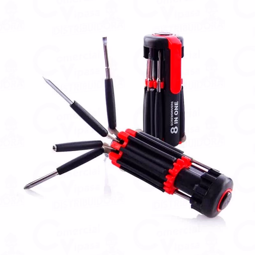 Possui 7 tipos de chave de fendas, com design compacto, fácil manuseio e pratico transporte com luz led.
