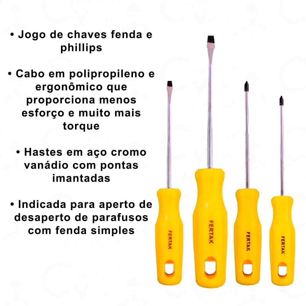 O Jogo de Chaves Fertak 4800 é ideal para quem busca precisão, durabilidade e praticidade no uso diário. Composto por 4 peças nas versões fenda e Philips, é fabricado em aço cromo vanádio (CRV), garantindo excelente resistência mecânica e longa vida útil. Perfeito para uso profissional e doméstico, em montagens, consertos e ajustes diversos.