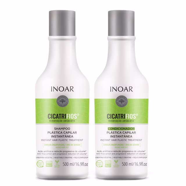 Shampoo e Condicionador Cicatrifios Plástica Capilar Instantânea tem, ação antifrizz e redução progressiva de volumes,
