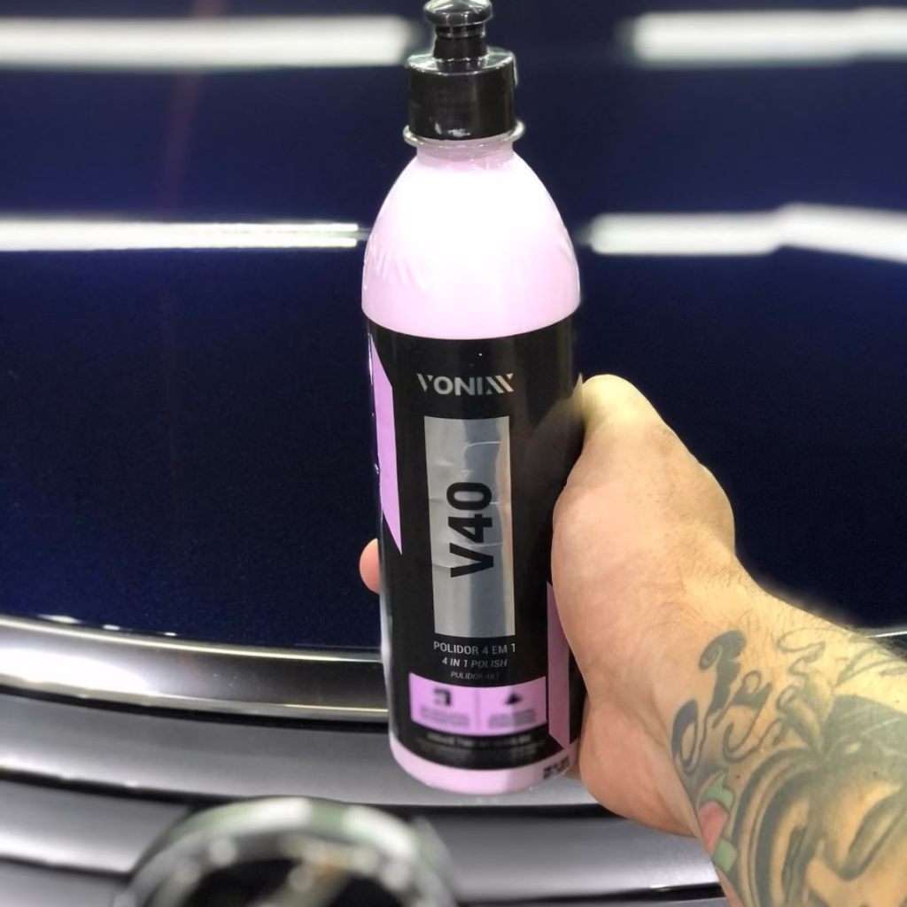V40 é um polidor 4 em 1, desenvolvido para uso em vernizes asiáticos ou macios. Sua fórmula exclusiva permite uso nas três etapas de polimento, mediante a troca de boinas, promovendo leve proteção da cera de carnaúba