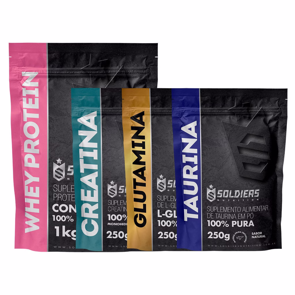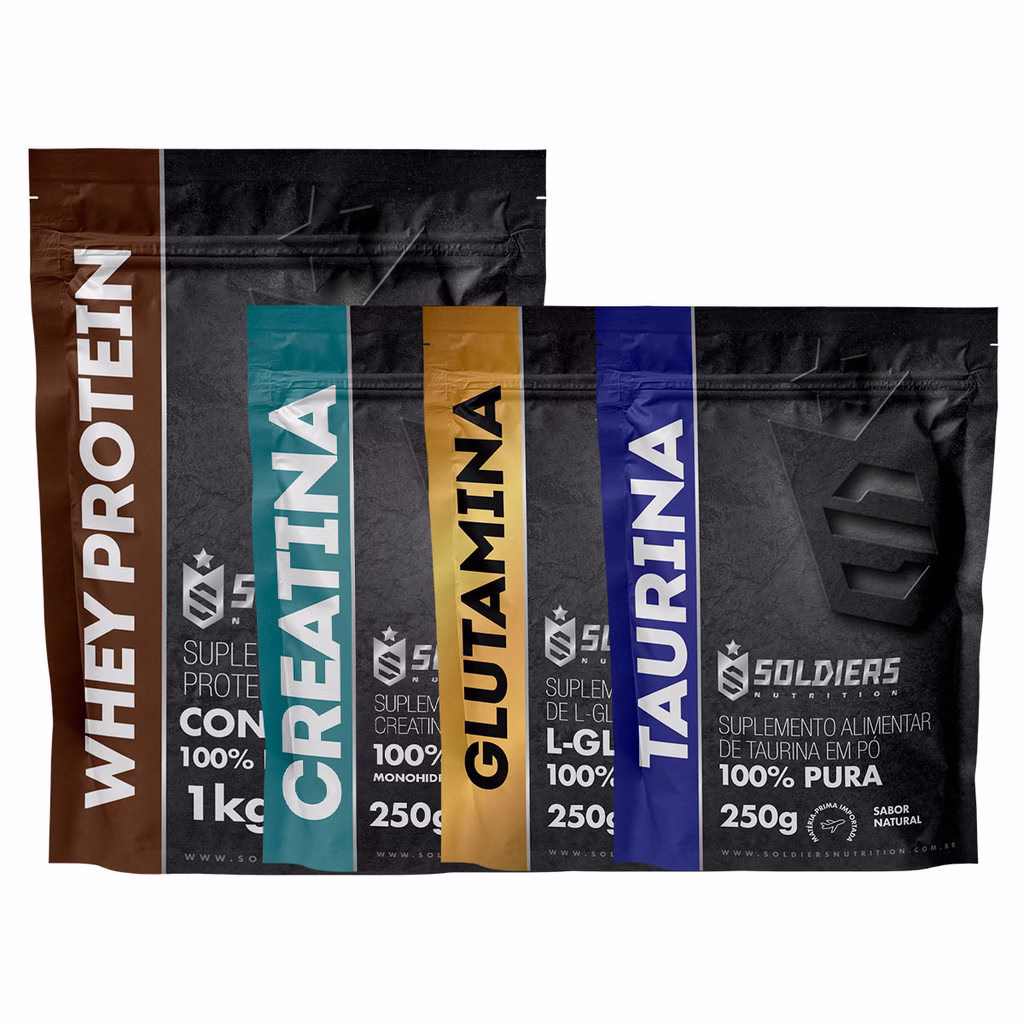 Kit: Whey Protein Concentrado + Creatina Monohidratada 250g + Glutamina 250g + Taurina 250g – 100% Importado – Soldiers NutritionESTE KIT CONTÉM OS SEGUINTES ITENS:- Whey Protein Concentrado 1Kg;- Creatina Monohidratada 250g;- Glutamina 250g;- Taurina 250gWhey Protein Concentrado 1Kg – 100% Importado – Soldiers NutritionMatéria-prima importadaPRODUTO COM LAUDO DE FABRICAÇÃOBENEFÍCIOS DO WHEY PROTEIN:- Combinação de aminoácidos fundamentais para um desempenho superior- Resposta mais rápida e eficaz das células e hormônios do organismo- Otimização do crescimento muscular- Papel antioxidante- Manutenção do sistema imunológico- Favorecimento da reparação muscular após o treinamentoSABORES: Chocolate Belga – Morango – Baunilha – Moccacino – NaturalO whey protein concentrado é um dos suplementos mais necessários para quem pratica musculação. Ele contém ótima quantidade de proteinas e demais ingredientes essenciais para o crescimento muscular. A combinação de aminoácidos é um fator muito importante para o ótimo desempenho.Creatina Monohidratada 250g – 100% Pura Importada – Soldiers NutritionAcompanha Colher Dosadora 3gBENEFÍCIOS DA CREATINA:- Aumenta a capacidade do músculo de gerar força;- Aumento de massa magra;- Aumento da capacidade de treinamento;- Previne o catabolismo muscular;A creatina é um derivado de aminoácidos obtida através da dieta de síntese por nosso próprio organismo. Ela está presente essencialmente no músculo e auxilia na manutenção dos níveis de energia durante períodos breves de exercício intenso. Ou seja, sua função é crucial nos treinos com muito peso na busca pelo ganho de massa.Glutamina 250g – 100% Pura Importada – Soldiers NutritionAcompanha Colher Dosadora 5gBENEFÍCIOS DA GLUTAMINA:- Controla o processo de anabolismo e catabolismo;- Removo os excessos de amônia e nitrogênio do corpo;- Regula a síntese e degradação de proteínas;- Regulação do sistema imune.A glutamina participa de forma relevante na síntese de outros aminoácidos e ajuda a manter a homeostase dos tecidos durante o processo de catabolismo. Outras funções importantes inerentes à glutamina é o fato dela conseguir liberar quantidades extras de hormônios na corrente sanguínea, como por exemplo, a testosterona.Taurina 250g – 100% Pura Importada – Soldiers NutritionBENEFÍCIOS DA TAURINA:- Construção de massa muscular;- Emagrecimento;- Anti-Catabolismo;- Diminuição da Fadiga Muscular;- Vasodilatador;- Ação antioxidante, combatendo os radicais livres que danificam as membranas celulares;- Ação desintoxicante, facilitando a excreção de substâncias pelo fígado que não são mais importantes ao corpo.A Taurina é uma substância essencial para aqueles que querem ganhar massa muscular. Ela ajuda evitar o catabolismo, pois ajuda o corpo a utilizar a gordura como fonte de energia evitando as proteínas sejam degradadas para garantir essa função.SOMOS FABRICANTES, PRODUTO DIRETO DA FÁBRICA PARA VOCÊ COM TOTAL GARANTIA DE QUALIDADEANVISA:Registro ISENTO conforme resolução RDC 27 de 06 de agosto de 2010 anexo I.Registro ISENTO conforme resolução RDC 240/2018.