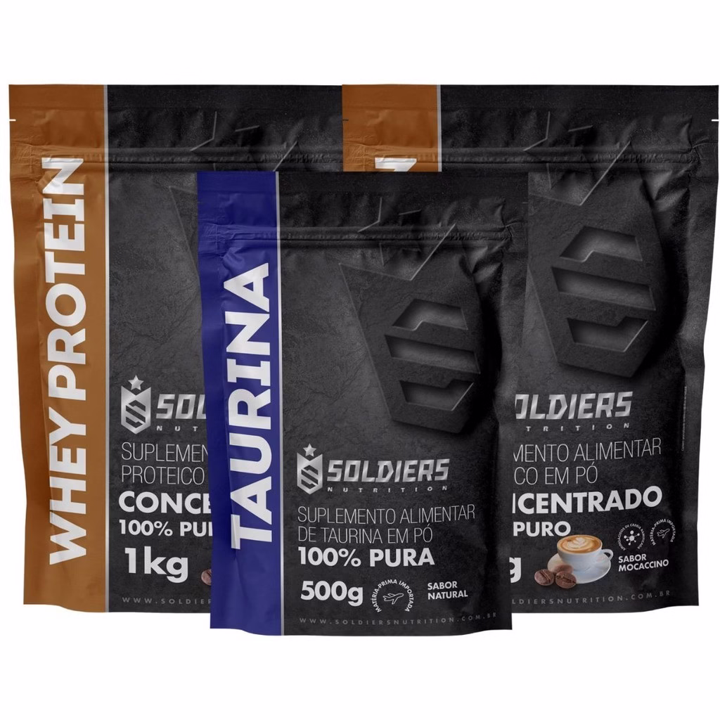 Kit: Whey Protein Concentrado 2kg + Taurina 500g – 100% Importado – Soldiers NutritionESTE KIT CONTÉM OS SEGUINTES ITENS:- Whey Protein Concentrado 2Kg- Taurina 500gWhey Protein Concentrado 2Kg – 100% Importado – Soldiers NutritionMatéria-prima importadaPRODUTO COM LAUDO DE FABRICAÇÃOBENEFÍCIOS DO WHEY PROTEIN:- Combinação de aminoácidos fundamentais para um desempenho superior;- Resposta mais rápida e eficaz das células e hormônios do organismo;- Otimização do crescimento muscular;- Papel antioxidante;- Manutenção do sistema imunológico;- Favorecimento da reparação muscular após o treinamento.SABORES: Chocolate Belga – Morango – Baunilha – Moccacino – NaturalO whey protein concentrado é um dos suplementos mais necessários para quem pratica musculação. Ele contém ótima quantidade de proteinas e demais ingredientes essenciais para o crescimento muscular. A combinação de aminoácidos é um fator muito importante para o ótimo desempenho.Taurina 500g – 100% Pura Importada – Soldiers NutritionBENEFÍCIOS DA L-TAURINA:- Construção de massa muscular;- Emagrecimento;- Anti-Catabolismo;- Diminuição da Fadiga Muscular;- Vasodilatador;- Ação antioxidante, combatendo os radicais livres que danificam as membranas celulares;- Ação desintoxicante, facilitando a excreção de substâncias pelo fígado que não são mais importantes ao corpo.A Taurina é uma substância essencial para aqueles que querem ganhar massa muscular. Ela ajuda evitar o catabolismo, pois ajuda o corpo a utilizar a gordura como fonte de energia evitando as proteínas sejam degradadas para garantir essa função.SOMOS FABRICANTES, PRODUTO DIRETO DA FÁBRICA PARA VOCÊ COM TOTAL GARANTIA DE QUALIDADEANVISA:Registro ISENTO conforme resolução RDC 27 de 06 de agosto de 2010 anexo I.Registro ISENTO conforme resolução RDC 240/2018.