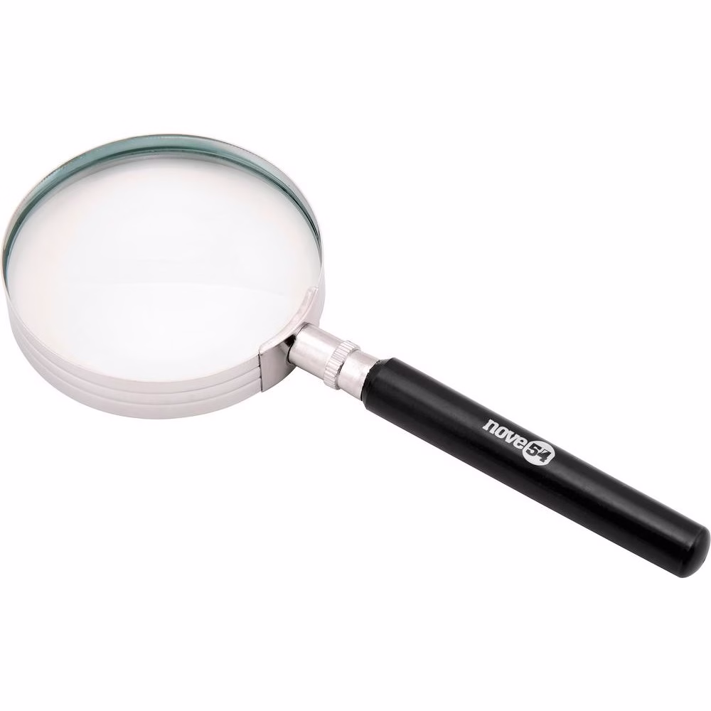 Lente em vidro convexo, corpo em aço cromado e cabo plástico que proporciona melhor manuseio