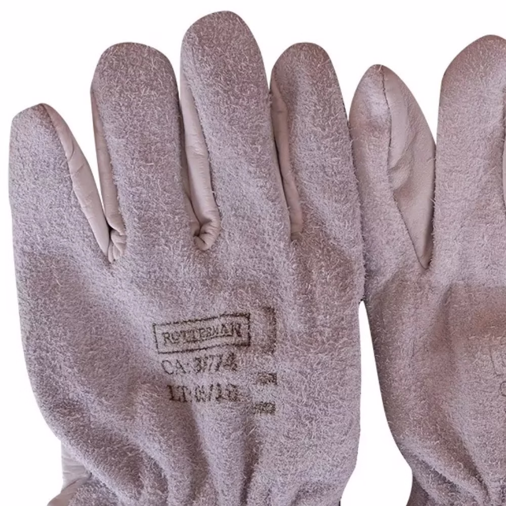 Luva de segurança confeccionada em raspa de couro, com dorso da mão em tecido vaqueta, punho em raspa de couro.