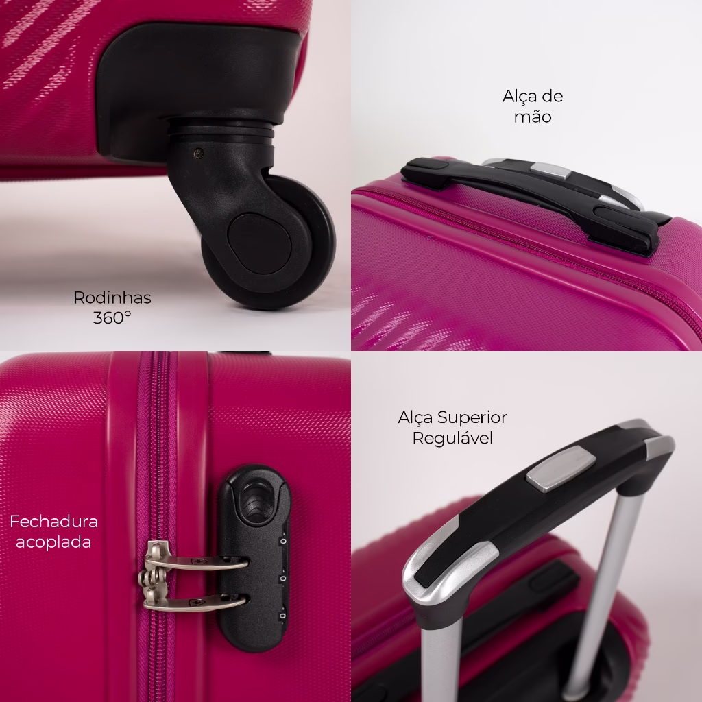 A mala de mão da linha Zug da Swiss Move, é a sua melhor opção. Isso porque é versátil produzida em ABS, um material forte e resistente, contém carrinho embutido com 4 rodas giratórias em 360°, alça superior que facilita o transporte e fechadura em zíper.