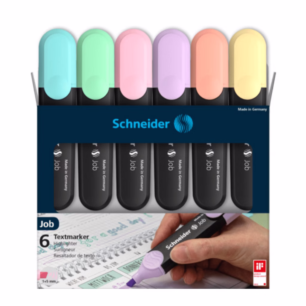 A tinta universal apresenta brilho máximo e boa resistência à luz em papel. O marcador Job apresenta um desempenho brilhante e recebeu o renomado prêmio IF e Red Dot Design em 2013. A forma mais fina com bordas arredondadas é perfeita para guardar no bolso ou no estojo. A tampa tem um clipe que se encaixa perfeitamente. Com seu grande reservatório de tinta, a o marcador Job pode destacar mais de 15.000 palavras.