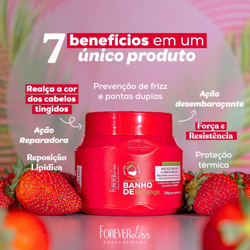 A Máscara Banho de Verniz Morango 250g hidrata profundamente os cabelos proporcionando brilho intenso, além de deixar os cabelos radiantes, macios e sedosos com a cor iluminada e protegida. Indicada para todos os tipos de cabelos, principalmente cabelos secos e danificados. Conta com um delicioso e suave aroma de morango, é liberado para Low Poo e entra na etapa de hidratação no Cronograma Capilar.