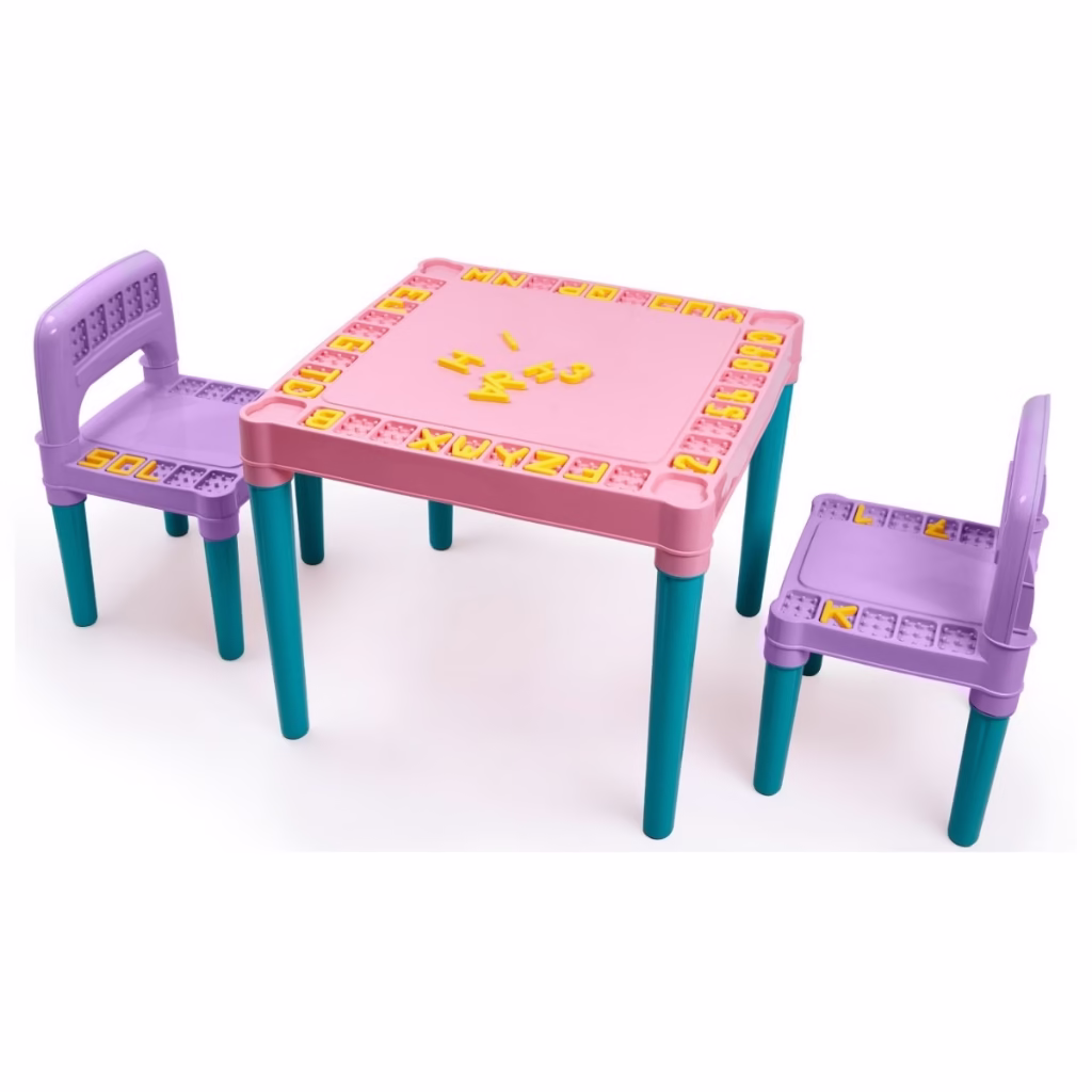 Produto confeccionado em plástico resistente, com pés de perfeito encaixe, que dá ao produto firmeza e sustentação durante o uso. O tampo da mesa e as cadeirinhas possui espaços para encaixar letrinhas, números, apoio de copo, giz de cera, estimulando o aprendizado de forma lúdica. Pode ser utilizado brincar e fazer suas atividades, tomar um lanche ou até fazer uma refeição;