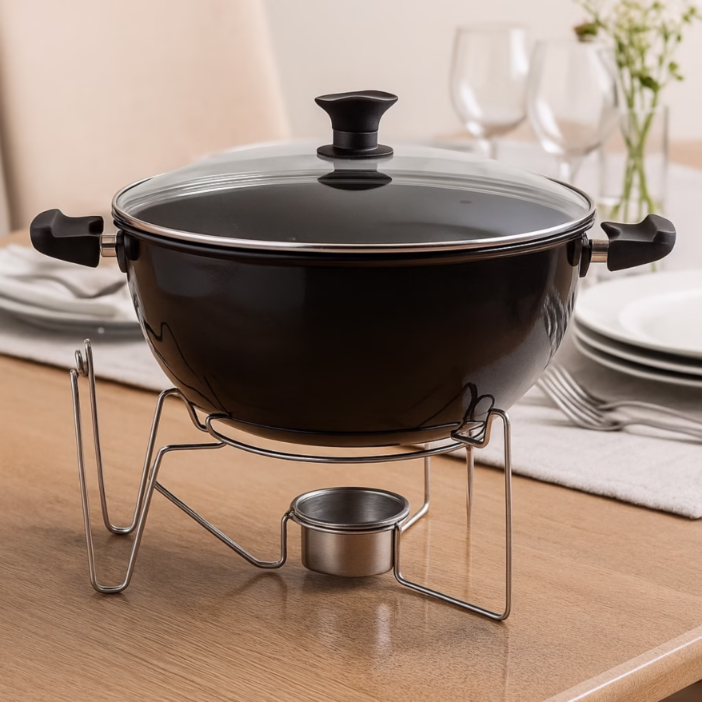 01 Rechaud, 01 tampa, 01 fogareiro, 01 suporte para tampa.