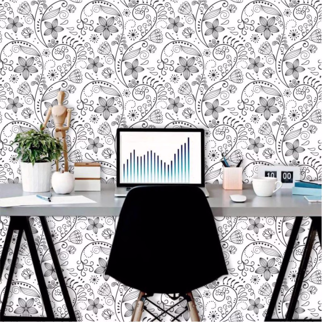 O papel de parede floral branco e preto em paredes preparadas com massa corrida, gesso, tinta látex e acrílica, azulejos (sem texturas). Podem ser aplicados em superfícies planas ou com curvaturas simples, na decoração de portas, divisórias, vidros, entre outros.