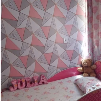 Papel de parede em tons predominantes de rosa e cinza, sem relevo. O nosso modelo é um adesivo vinílico, autocolante, liso e lavável. Produzido em impressão digital de alta qualidade.