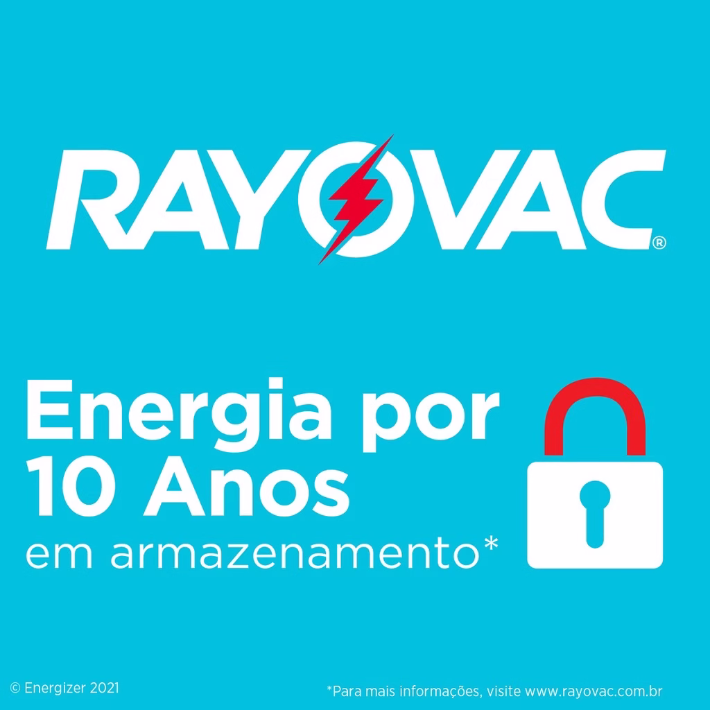 As pilhas alcalinas Rayovac entregam longa duração e alta performance em dispositivos de alto consumo de energia, como brinquedos, lanternas etc. Possuem 10 anos de validade: Garantimos que, se não utilizadas, as pilhas podem ser armazenadas por até 10 anos mantendo no mínimo, 60% da carga. Livres de mercúrio e cádmio.