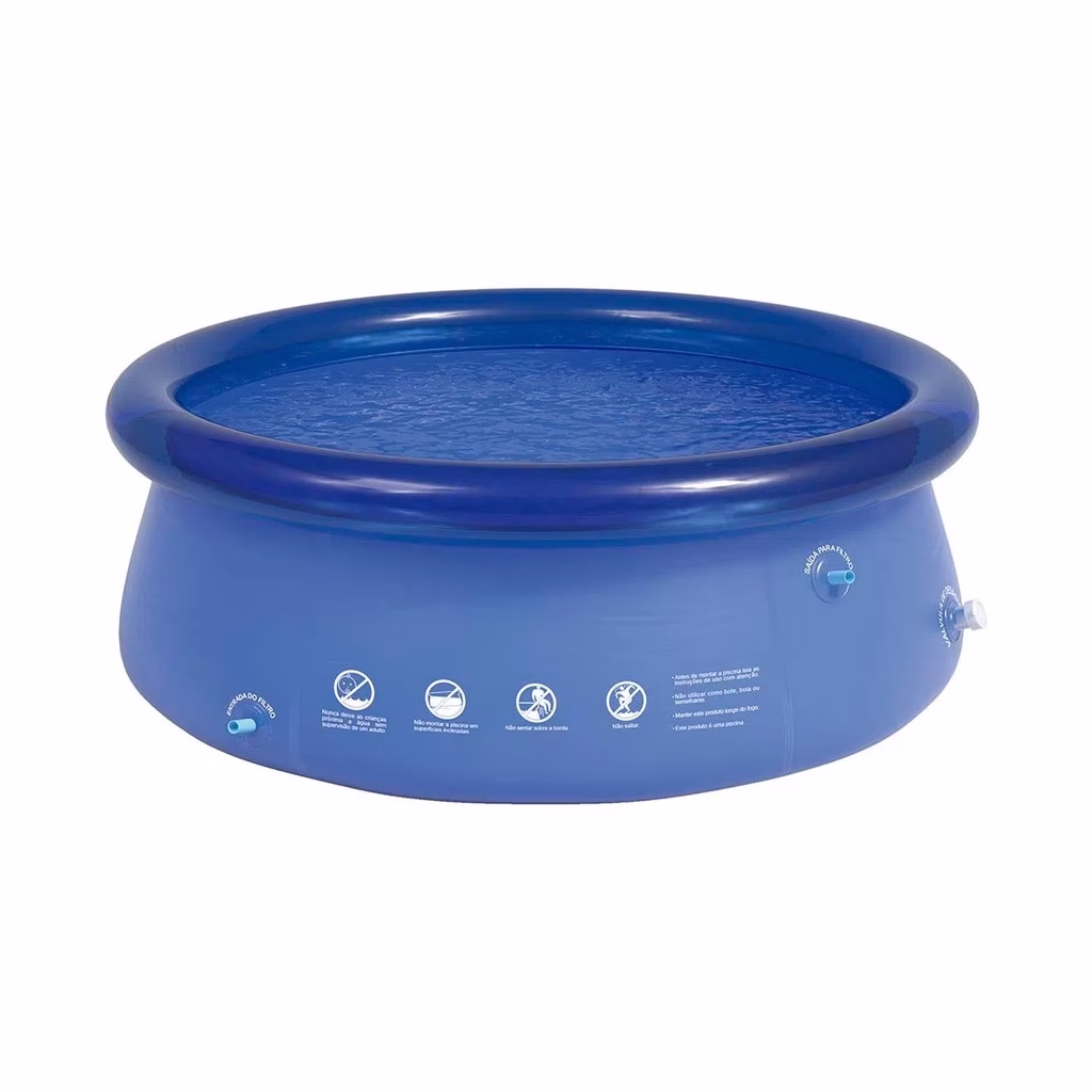 Para sua montagem, basta estender a lona no chão, inflar a borda e encher de água até a altura indicada no manual. É isto mesmo! A sua única estrutura é a água, evitando quinas e peças rígidas que podem ferir os pequenos.