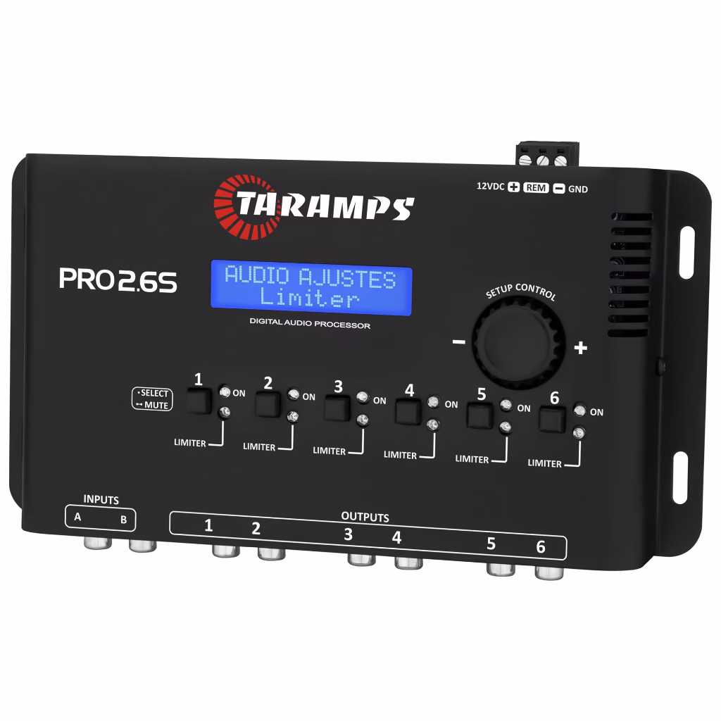 Dedicada em sempre facilitar a sua experiência com seu som automotivo, a Taramps inovou com processador de áudio PRO2.6S. Com DSP, 2 entradas e 6 saídas independentes, possui recursos como roteamento, filtros para crossover, ajuste de delay, alinhamento, inversão de fase, limiter ajustável, equalizador paramétrico nas saídas, espelhamento, mute, gerador de onda senoidal e memória para os ajustes. Praticidade e recursos para deixar seu sistema de som mais completo.