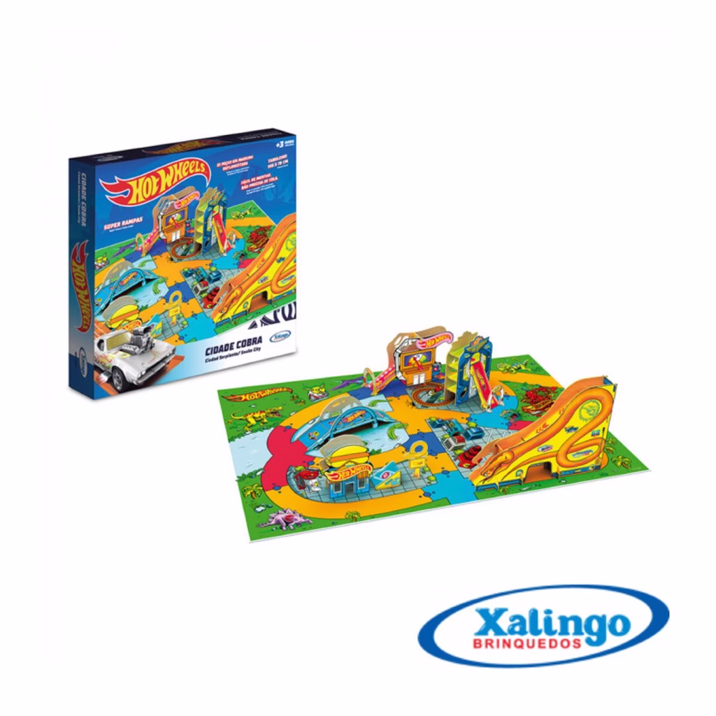 Composto por um tabuleiro 100 x 70 cm, rampas e prédios em formato da cidade Cobra Hot Wheels para a criança brincar com seus carrinhos preferidos.