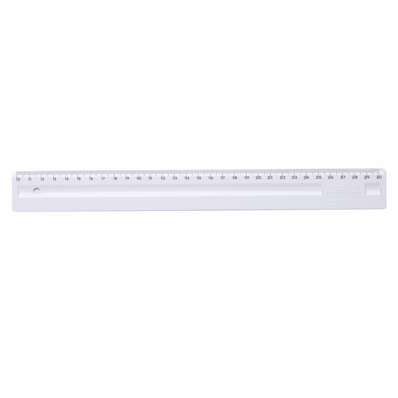 Produto certificado no âmbito brasileiro de qualidade, conforme Portaria Inmetro Nº 333/2012:Segurança, Compulsório, Registro 001540/2013, IQB0006, INMETRORégua plástica 30cm – branca – 3111.E – Dello Descrição – Medidas: 310 x 34 x 3 mm. – Régua de 30cm injetada em poliestireno, super resistente (espessura de 3,4 mm).- Permite apoio central para os dedos, mais firmeza de manuseio e precisão no traçado. – Ótima para crianças e para guiar leitura de textos.