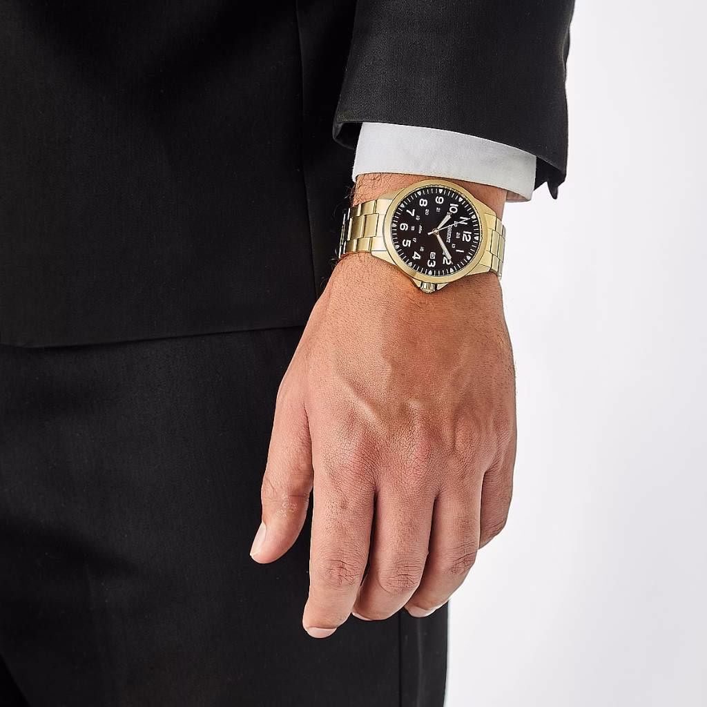 Relógio ORIENTMgss1199 P2kxGenero: Masculino Funções – Analógico- Calendário dia do mês Características – Analógico / Quartz- Coroa: Simples- Tampa posterior : Rosqueada- Resistência à água : 50m- Vidro : Cristal Mineral- Mostrador Preto com numeros branco- Material da caixa : Aço Dourado- Material da pulseira : Aço Dourado Medidas – Diâmetro da caixa : 4,4 cm- Diâmetro do visor : 3,8 cm- Espessura da caixa : 0,8 cm- Largura da pulseira: 2,2 cm Acompanha- Manual- Nota Fiscal- Embalagem Orient- Garantia de 1 ano