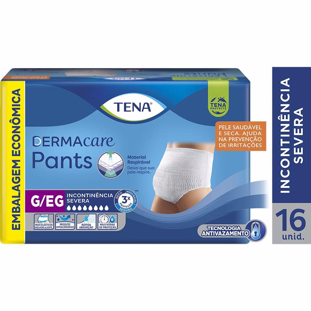 TENA Pants Dermacare é uma roupa íntima descartável e unissex de rápida absorção, que proporciona ao usuário ativo segurança e proteção da pele. Um produto hipoalergênico com tecido respirável e macio que ajuda na prevenção de irritações, permitindo que a pele esteja sempre saudável e seca. A excepcional segurança deve-se à tecnologia antivazamento que absorve rapidamente grandes quantidades de urina mantendo-a longe da pele de forma que, mesmo sentado ou deitado durante muito tempo, o usuário permanece seco e confortável, reduzindo significativamente o risco de infecções cutâneas. É indicado para perdas de urina severa.