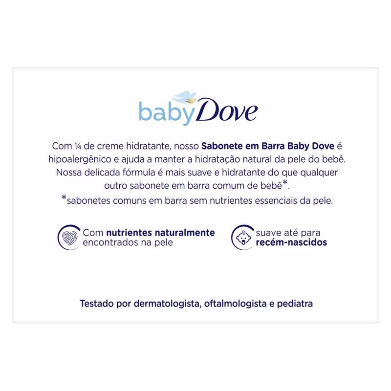 O sabonete Baby Dove não vai deixar a pele do seu bebê limpa e bem cuidada através de sua limpeza suave e reposição de nutriente. É tão suave que é adequado até mesmo em recém-nascidos.