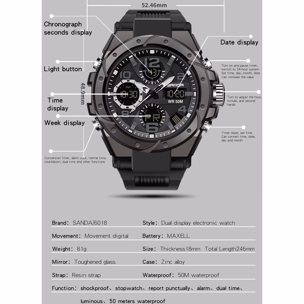 Recurso: Calendário completo, resistente a choques, cronômetro, data automática, resistente à água, mergulhador, cronógrafo, luz de fundo, fuso horário múltiplo, natação, alarme