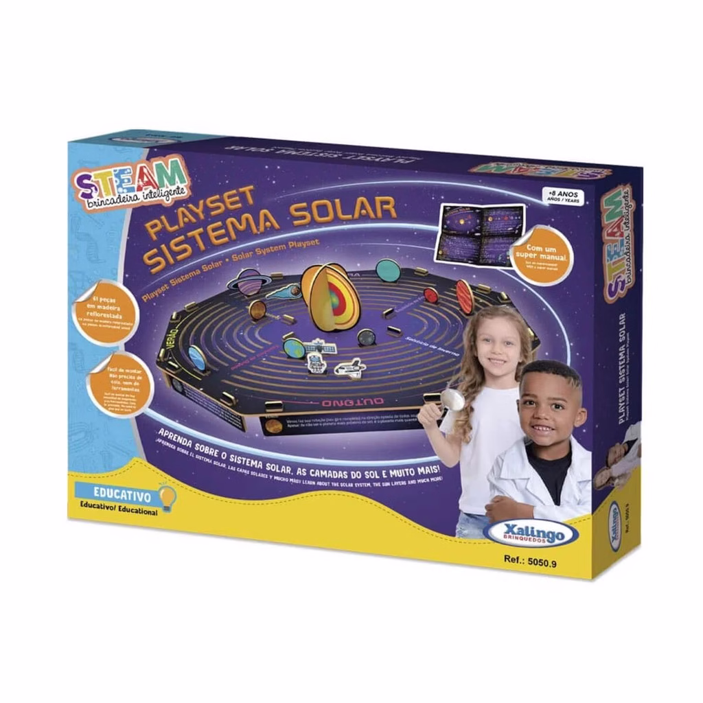 Com o Playset Steam Sistema Solar, um jogo tridimensional em MDF que as crianças aprendem brincando através dos dados sobre o sistema solar e seus planetas, distância, composição etc.