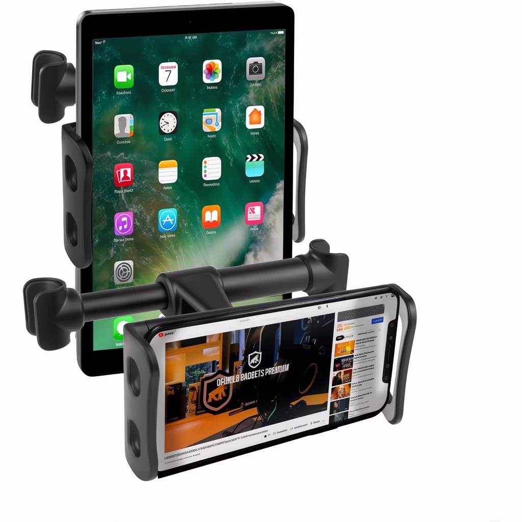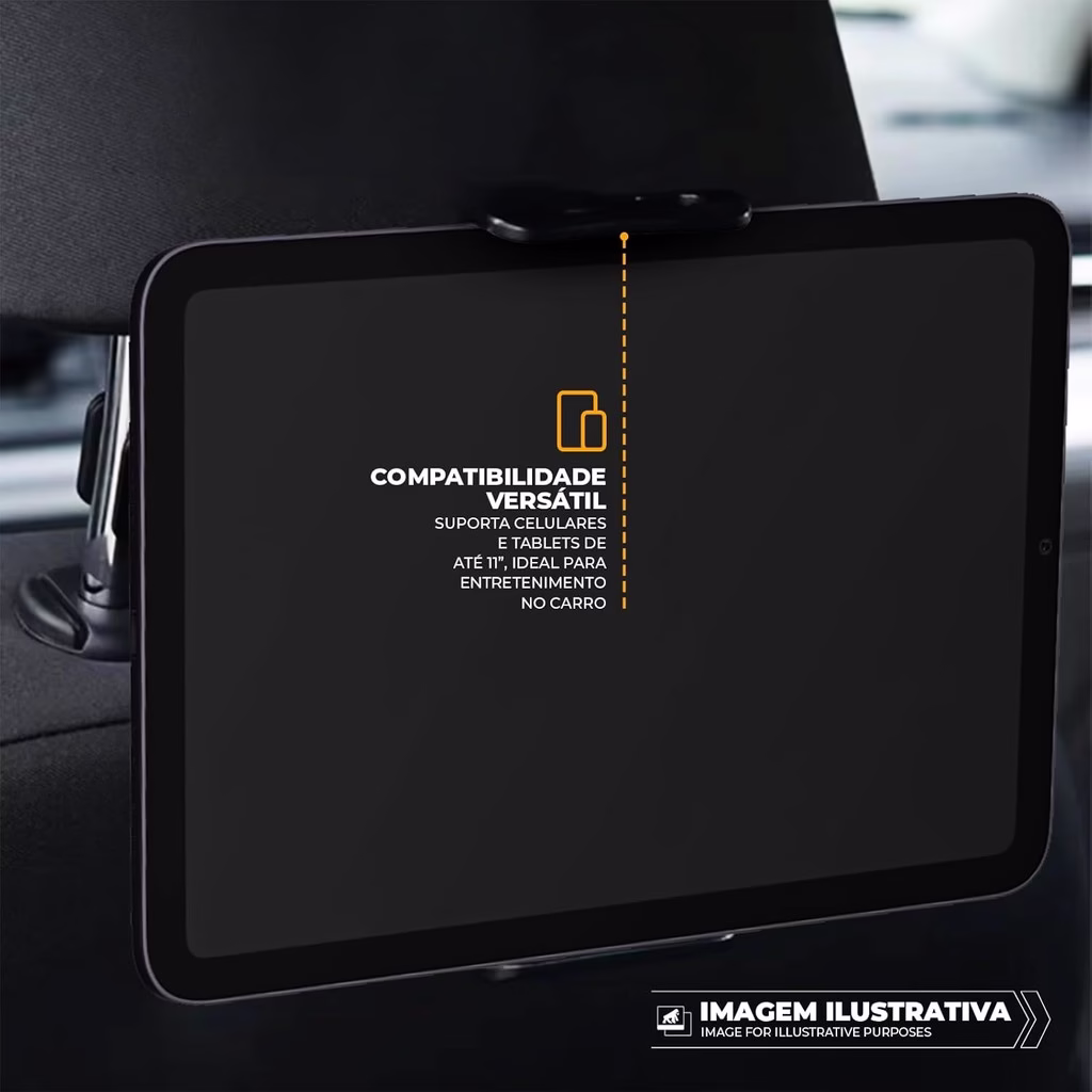 A instalação do suporte no automóvel é fácil. Basta empurrar o braço retrátil do acessório e encaixá-lo na parte traseira do encosto de cabeça do banco. Os braços expansíveis são compatíveis com tablets de até 11 polegadas. O usuário ainda pode mover a tela em até 180°, possibilitando a visualização de quem está no banco do lado.