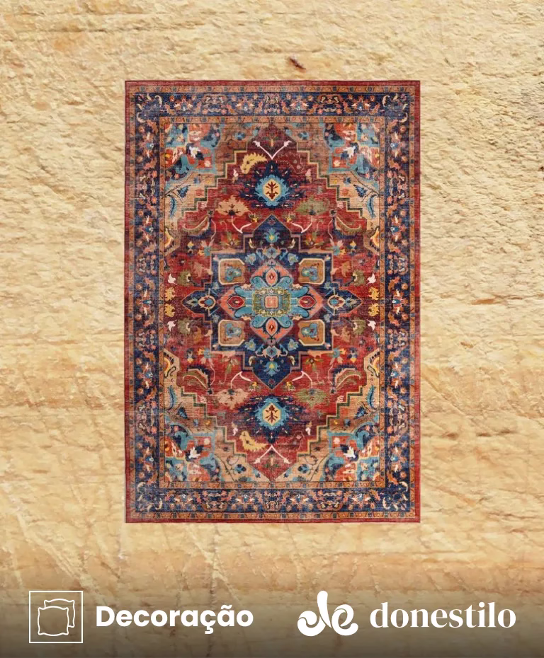 A estampa traz um design clássico e elegante, com medalhão central geométrico e linhas curvas. A paleta combina tons quentes de vermelho e terracota com azul e turquesa, criando um ambiente sofisticado e acolhedor.