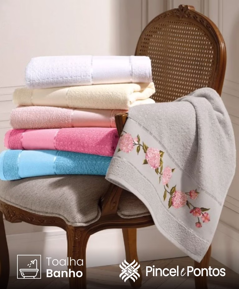 Excelente Toalha de Banho Döhler Multi Arte III com medida de 70 cm x 140 cm em tecido felpudo e barra para bordados personalizados e aplicações.