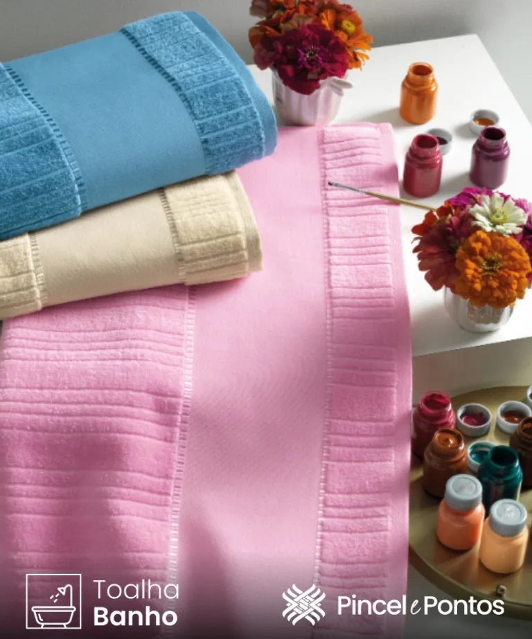 Toalha de Banho Karsten Stella 67×140 cm para Pintar e Bordar na máquina: Barra de 11 cm, ideal para pintura, patch aplique, bordado em máquina e ponto cheio. É antipilling, com corpo de veludo e textura suave. Composta por 99% de algodão, 1% de viscose e gramatura 400g/m², garante boa absorção. Excelente para uso diário e personalização.