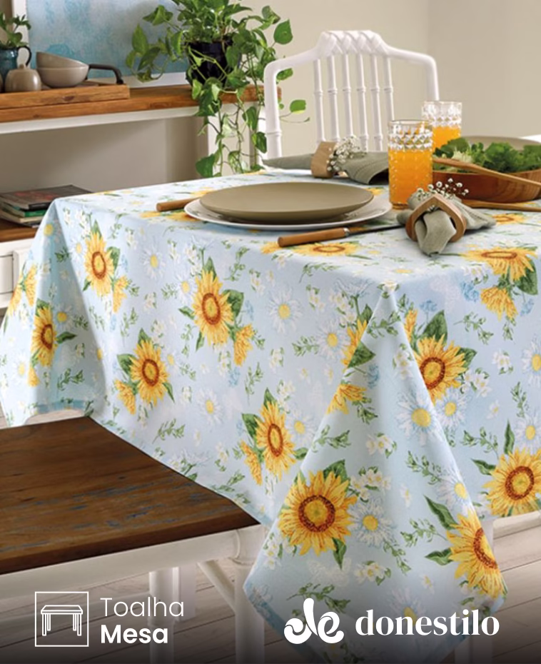 Toalha de Mesa Quadrada Döhler para 4 lugares, modelo Athenas Ida (1,40 x 1,40 m), em sua estampa conta com fundo azul claro e ilustra girassóis, margaridas e borboletas. Prática e versátil, é ideal para o dia a dia. Além disso, o produto possui o selo Döhler Clean, que adiciona uma camada protetora, facilitando a limpeza e aumentando a durabilidade da toalha. Confeccionada com 50% algodão e 50% poliéster, esta toalha tem gramatura de 170 g/m², combinando resistência e suavidade ao toque.