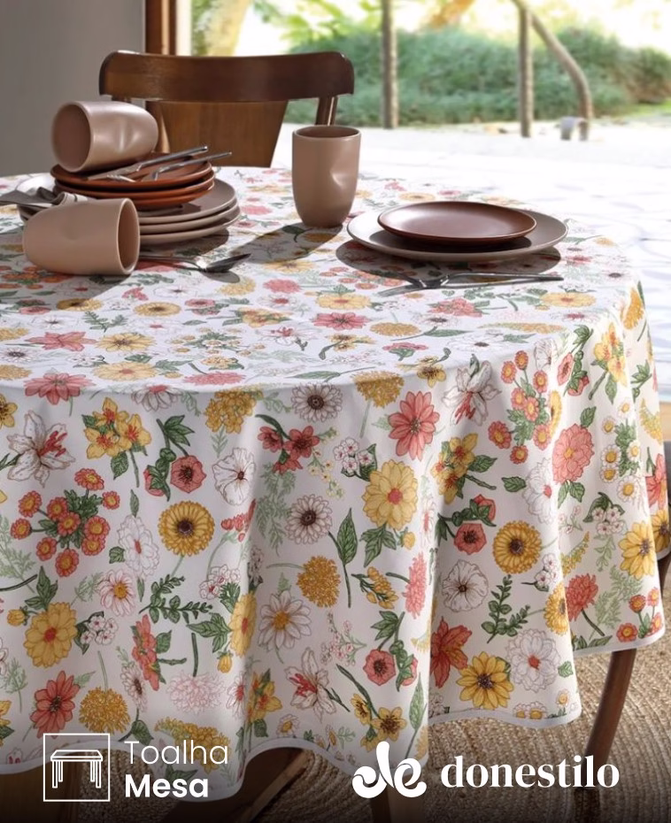 Toalha de Mesa Redonda Döhler para 4 lugares, modelo Athenas Elane (1,60 m), com estampa floral. Prática e versátil, é ideal para o dia a dia. Além disso, o produto possui o selo Döhler Clean, que adiciona uma camada protetora, facilitando a limpeza e aumentando a durabilidade da toalha. Confeccionada com 50% algodão e 50% poliéster, esta toalha tem gramatura de 170 g/m², combinando resistência e suavidade ao toque.
