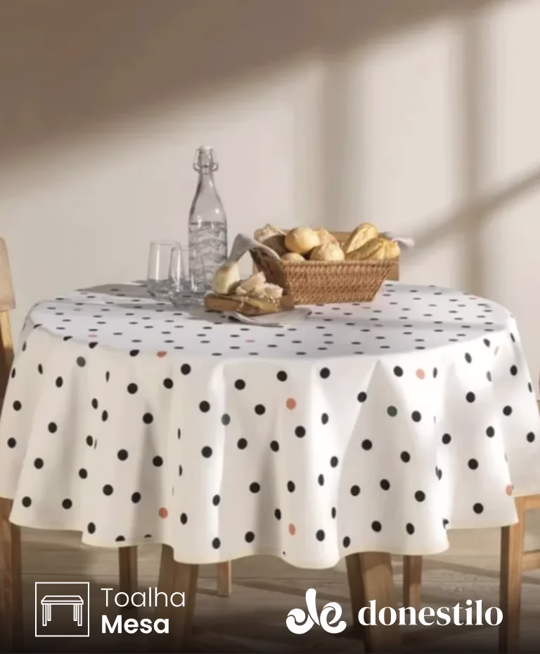 Toalha de Mesa Redonda Döhler para 4 lugares, modelo Athenas Menu (1,60 m), com estampa moderna, com cor neutra de fundo e poá na cor preta e laranja. Prática e versátil, é ideal para o dia a dia. Além disso, o produto possui o selo Döhler Clean, que adiciona uma camada protetora, facilitando a limpeza e aumentando a durabilidade da toalha. Confeccionada com 50% algodão e 50% poliéster, esta toalha tem gramatura de 170 g/m², combinando resistência e suavidade ao toque.