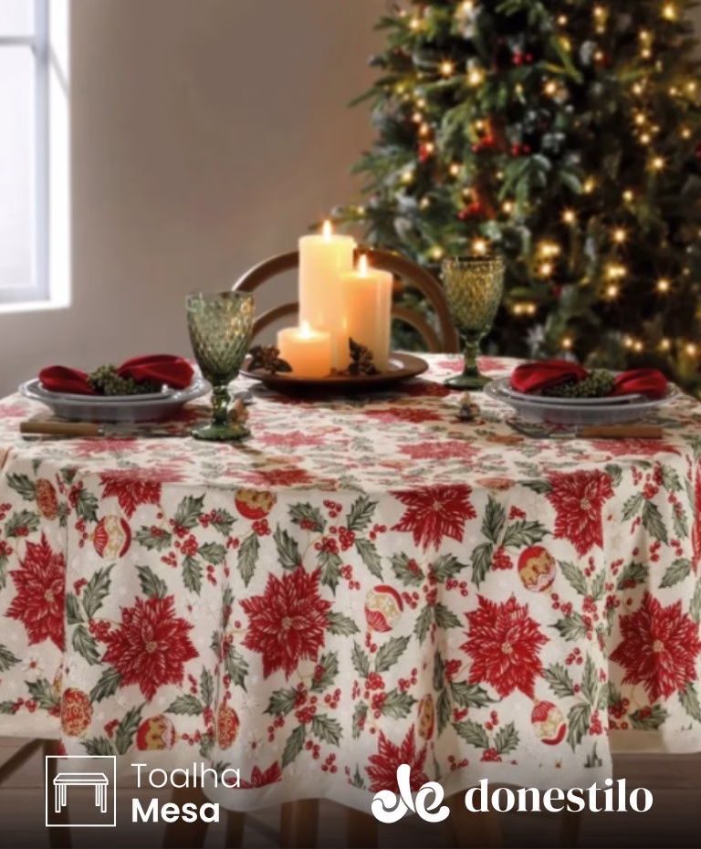 Toalha de Mesa Redonda Döhler Celebra Natal 106 (160 cm) para 4 lugares. Em 55% poliéster e 45% algodão, oferece durabilidade, elegância e aconchego.