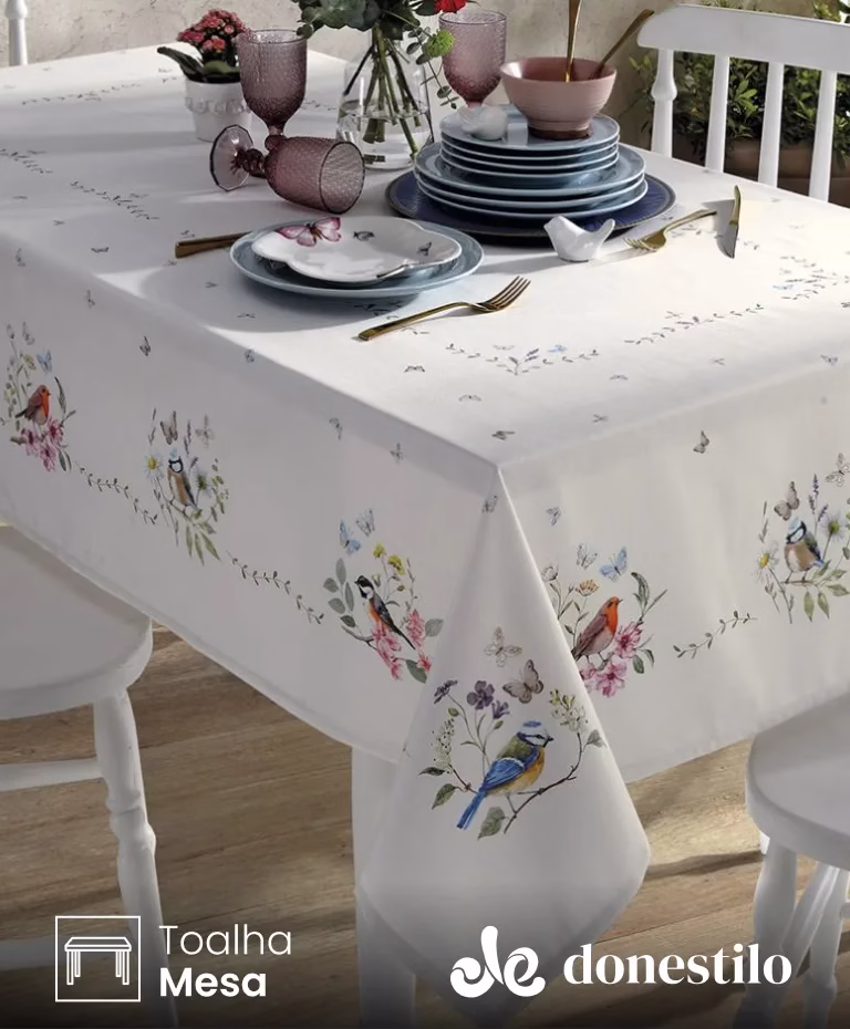 Toalha de Mesa Retangular Döhler Renova Jardim 6 lugares (1,40 x 2,10 m) com estampa digital de passarinhos, proteção Döhler Clean e tecido durável 50% algodão/50% poliéster.