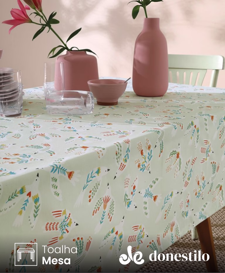 Toalha de Mesa Retangular Döhler para 8 lugares, modelo Athenas Erica (1,60 x 2,50 m). Sua estampa traz delicadas ilustrações de pássaros brancos e ramos florais sobre um suave fundo verde-claro, criando uma composição leve e encantadora. Prática e versátil, é ideal para o dia a dia. Além disso, o produto possui o selo Döhler Clean, que adiciona uma camada protetora, facilitando a limpeza e aumentando a durabilidade da toalha. Confeccionada com 50% algodão e 50% poliéster, esta toalha tem gramatura de 170 g/m², combinando resistência e suavidade ao toque.
