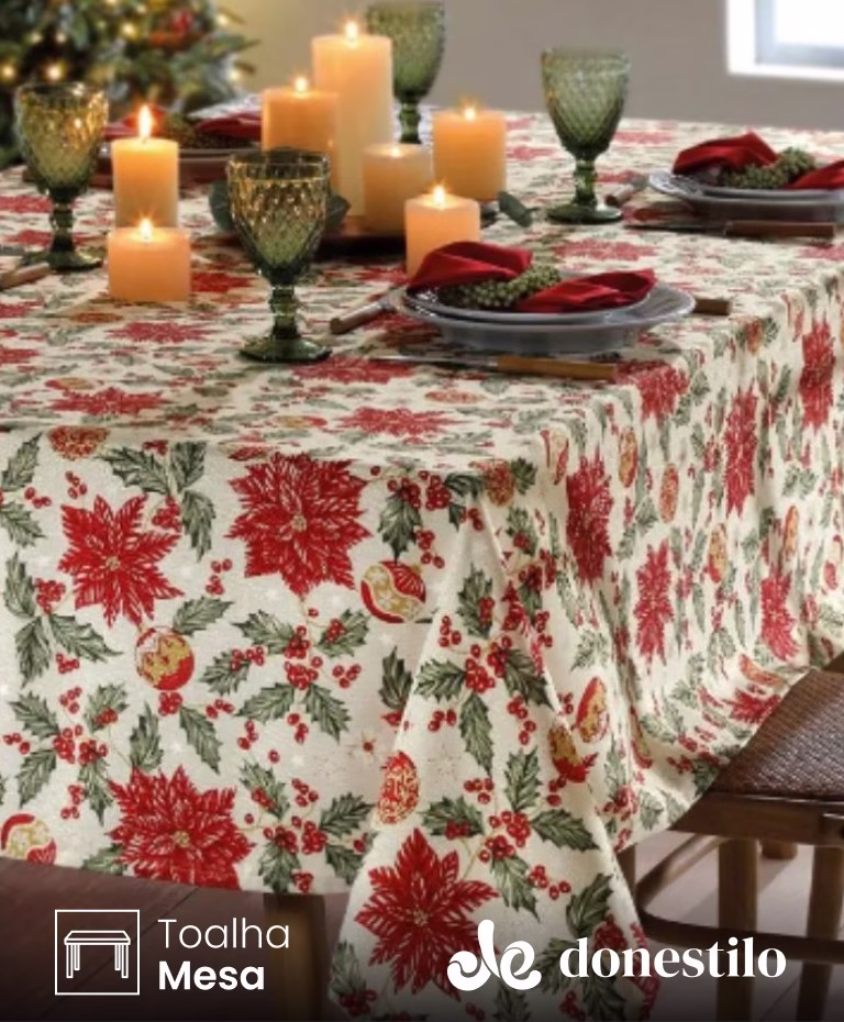 Toalha de Mesa Retangular Döhler Celebra Natal 106 (160×270 cm) para 8 lugares. Em 55% poliéster e 45% algodão, oferece durabilidade, elegância e aconchego.