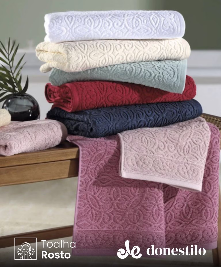 Toalha de Rosto Döhler Provença 50 × 90 cm com 100% Algodão e gramatura de 450 g/m². O acabamento aumenta a maciez e absorção. O tecido em jacquard confere sofisticação. Ele proporciona uma textura macia e confortável ao toque. A toalha oferece alta absorção e suavidade, tornando-se ideal para quem busca praticidade e elegância no dia a dia.