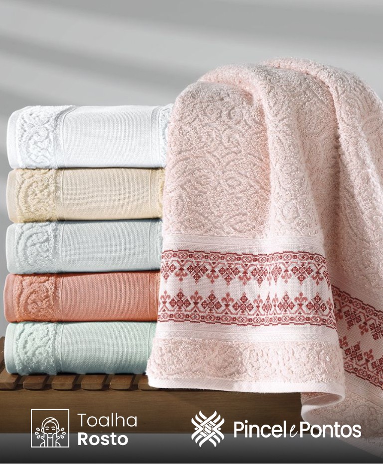Toalha de Rosto Döhler Sofia, 50x80cm, 100% algodão, 480g/m². Alta absorção, felpa macia e encorpada. Barra de 60 pontos ideal para bordar em Ponto Cruz.