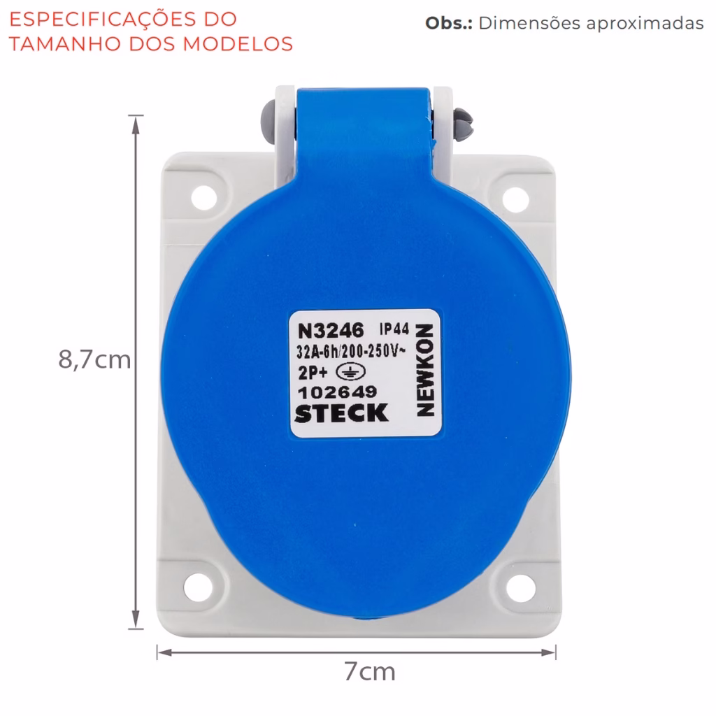 A tomada fixa de embutir Newkon Steck N3246 em corrente nominal de 32A, tensao nominal (V) de 200/250 e 3 polos.Com grau de protecao IP44. Os produtos da linha Newkon sao produtos em conformidade com as normas IEC 60309-1/2/4, 60259 & 60695-2-11 que permitem a alimentacao de instalacoes ou equipamentos eletricos. Temperatura de trabalho continuo: -25?C a 120?C e 30 minutos: ate 200?C. Resistencia ao fogo 650?C1 & 850?C2. Cor da carcaca: cinza claro. Composicao: carcaca e tampas em poliamida 66, vedacoes em borracha natural NR. Contatos em ligas de cobre e parafusos em aco SAE 1018.