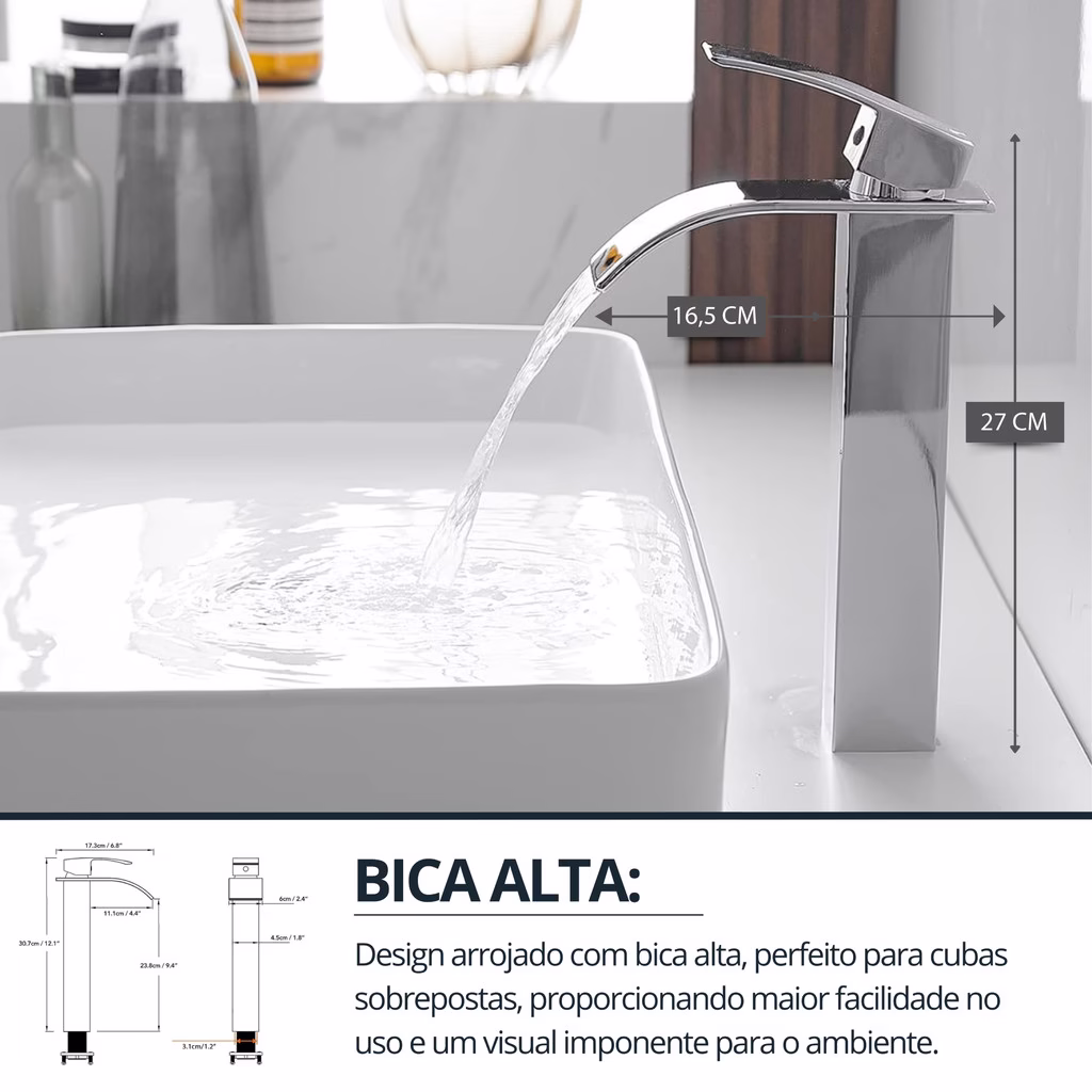 A Torneira cascata para banheiro com monocomando e bica alta combina funcionalidade e estética. Seu design moderno cria uma cascata suave de água, enquanto o sistema monocomando permite ajustes precisos de temperatura e intensidade. A bica alta proporciona praticidade e um toque contemporâneo à sua pia, elevando a experiência no banheiro.