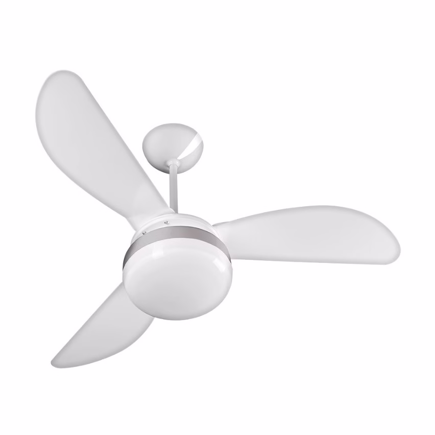 3 pás em plástico de engenharia com garras embutidas na cor branca. Maior aerodinâmica proporcionando maior ventilação Lustre injetado com excelente acabamento Base em plástico de engenharia